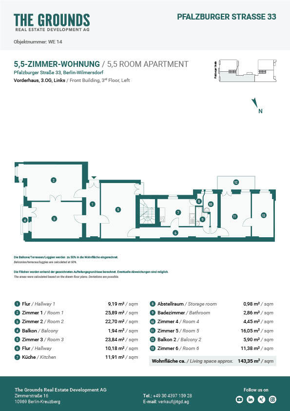 Die sanft rosafarbene Fassade der Hausnummer 33 setzt einen frischen, unkonventionellen Akzent in diesem klassischen Wilmersdorfer Viertel. Über den begrünten Innenhof und die altbautypischen Treppenhäuser gelangt man zu den stilvoll gestalteten Wohnungen mit 1 bis 5 Zimmern.