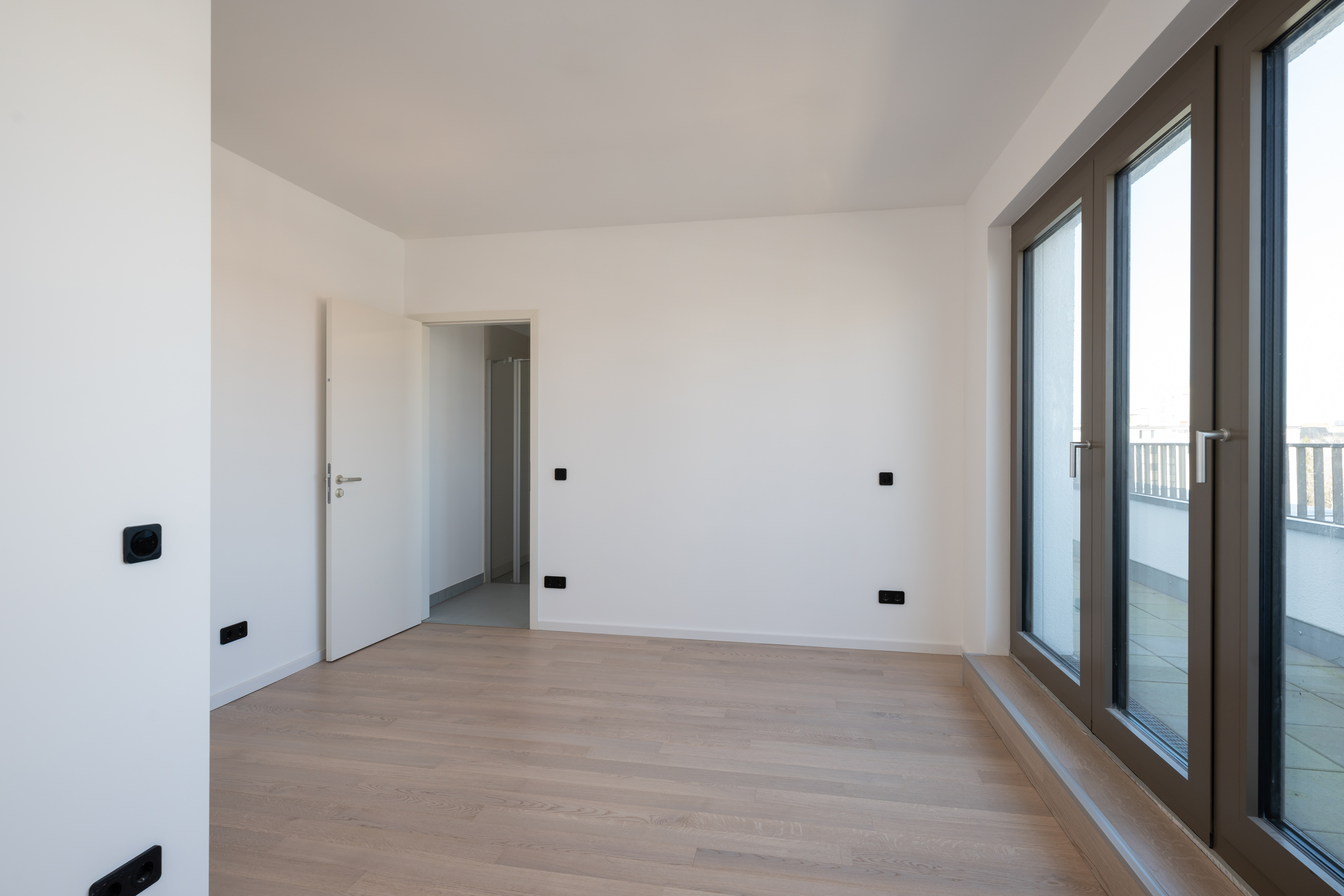 Herzstück der Wohnung ist der großzügige Wohn-/Essbereich, der durch die Terrassen auf beiden Seiten optisch erweitert wird und viel Tageslicht erhält. Die an den Wohnbereich angrenzende Küche fügt sich harmonisch in das Raumkonzept ein und ermöglicht kurze Wege zwischen Kochen, Essen und Entspannen. Zwei gut proportionierte Schlafzimmer liegen ruhiger im Wohnungszuschnitt und bieten Platz für individuelle Einrichtungsideen, vom komfortablen Hauptschlafzimmer bis zum Arbeits oder Gästezimmer.