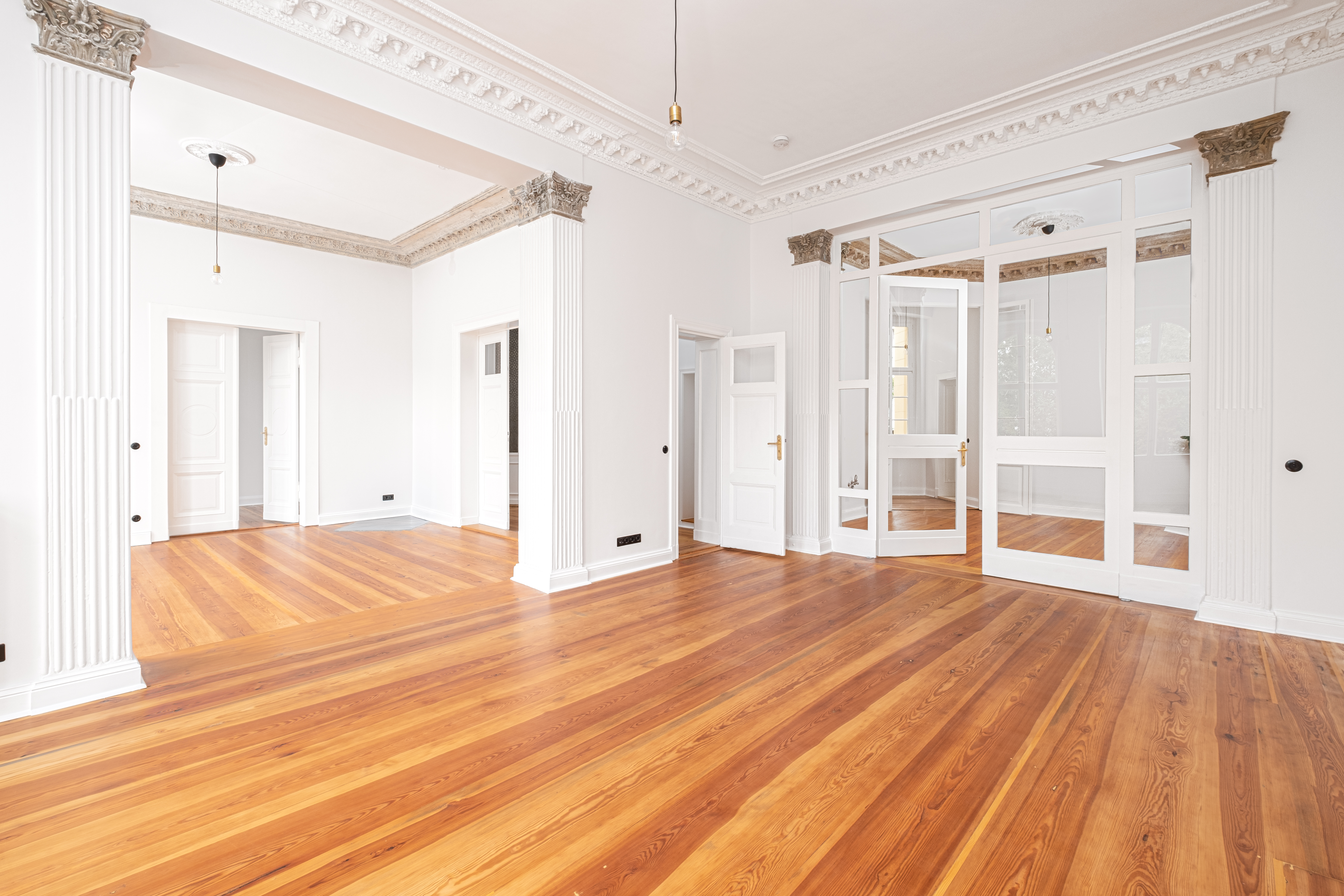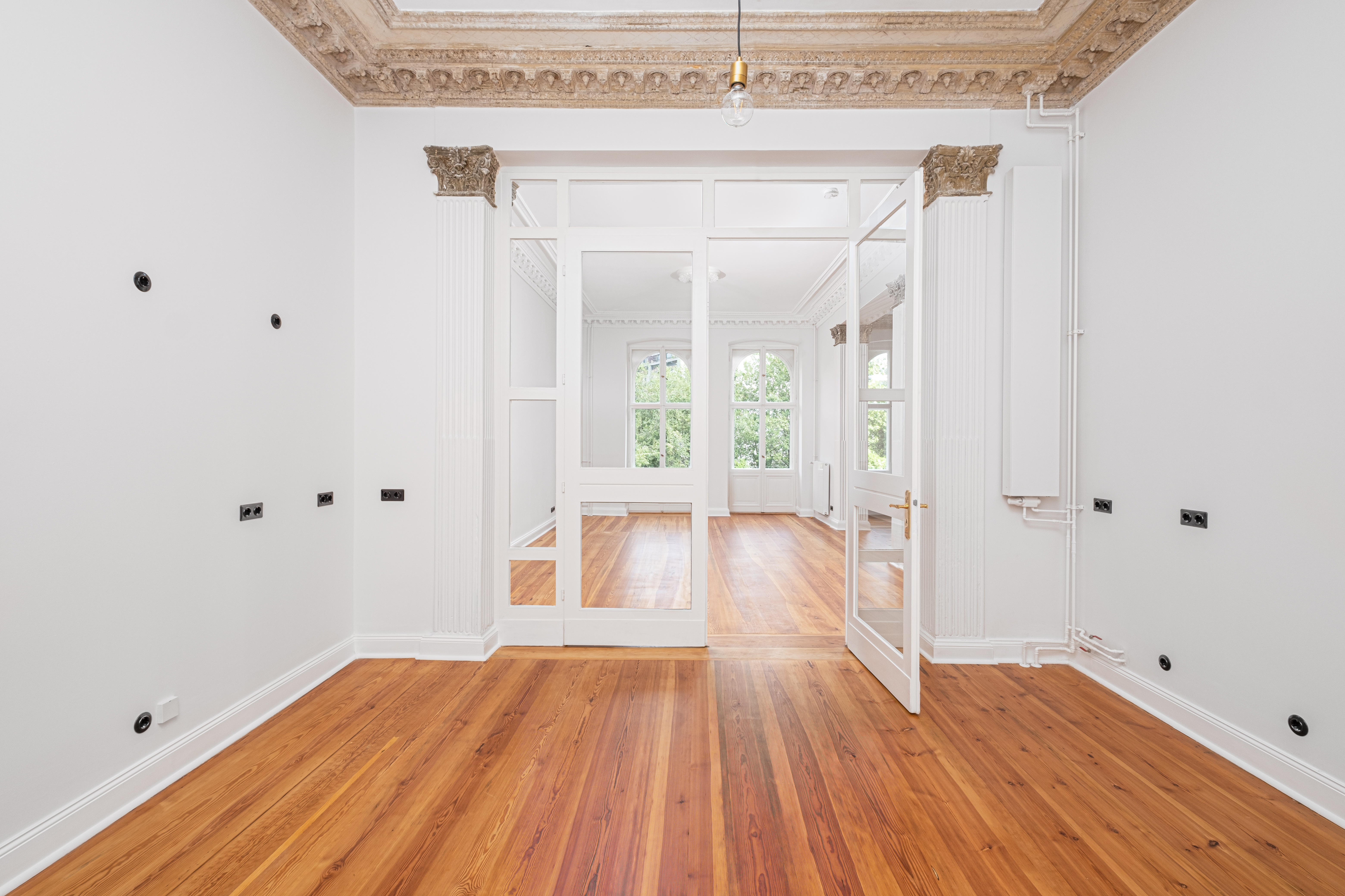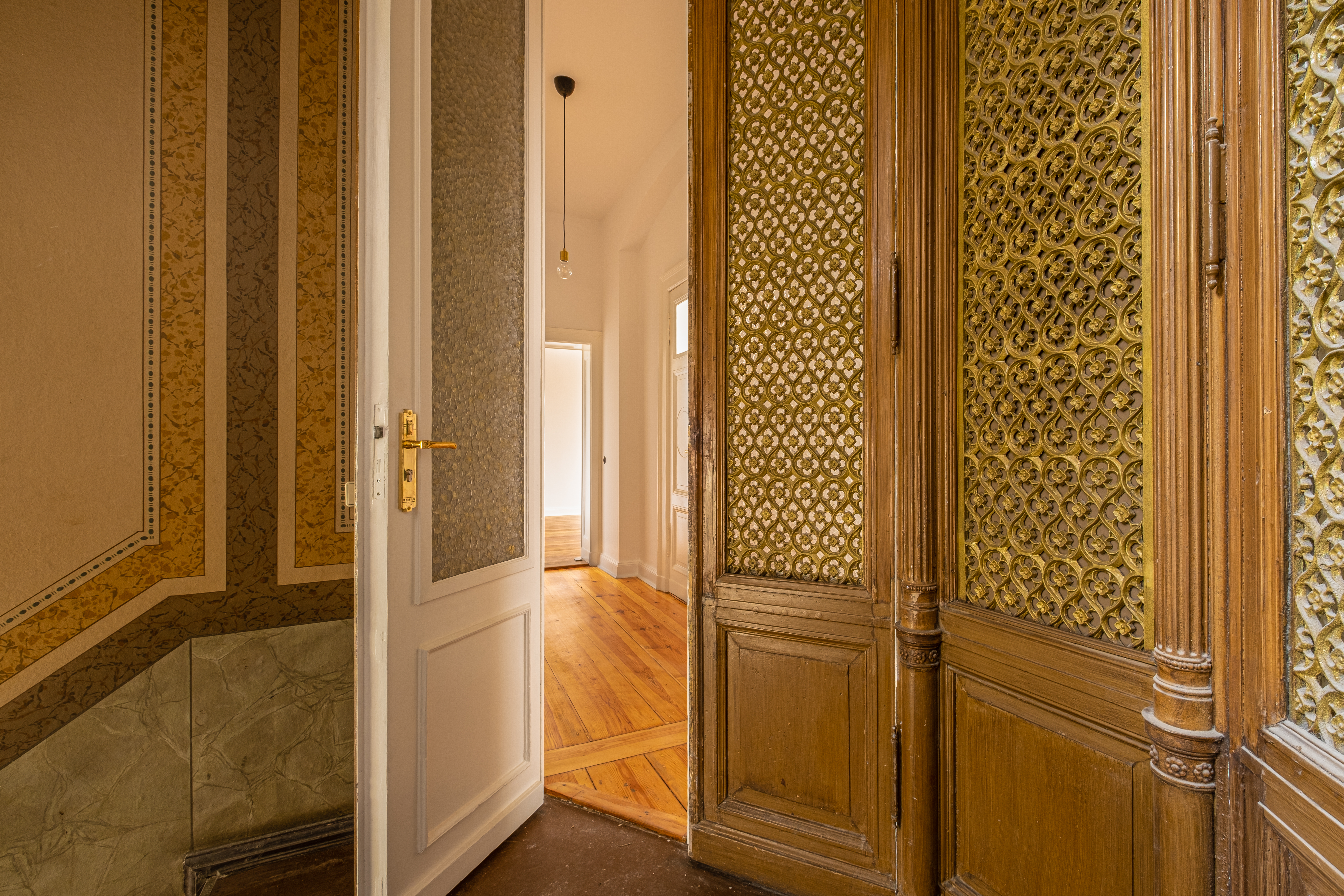 Diese herrschaftliche Altbauwohnung im ersten Obergeschoss begeistert mit ca. 148 m² Wohnfläche, aufgeteilt in 5 große Zimmer. Stuckelemente, Flügeltüren und ein alter Kaminofen unterstreichen den historischen Charme, während die frische Renovierung für modernen Wohnkomfort sorgt. Hohe Decken und große Fenster schaffen ein lichtdurchflutetes Ambiente.