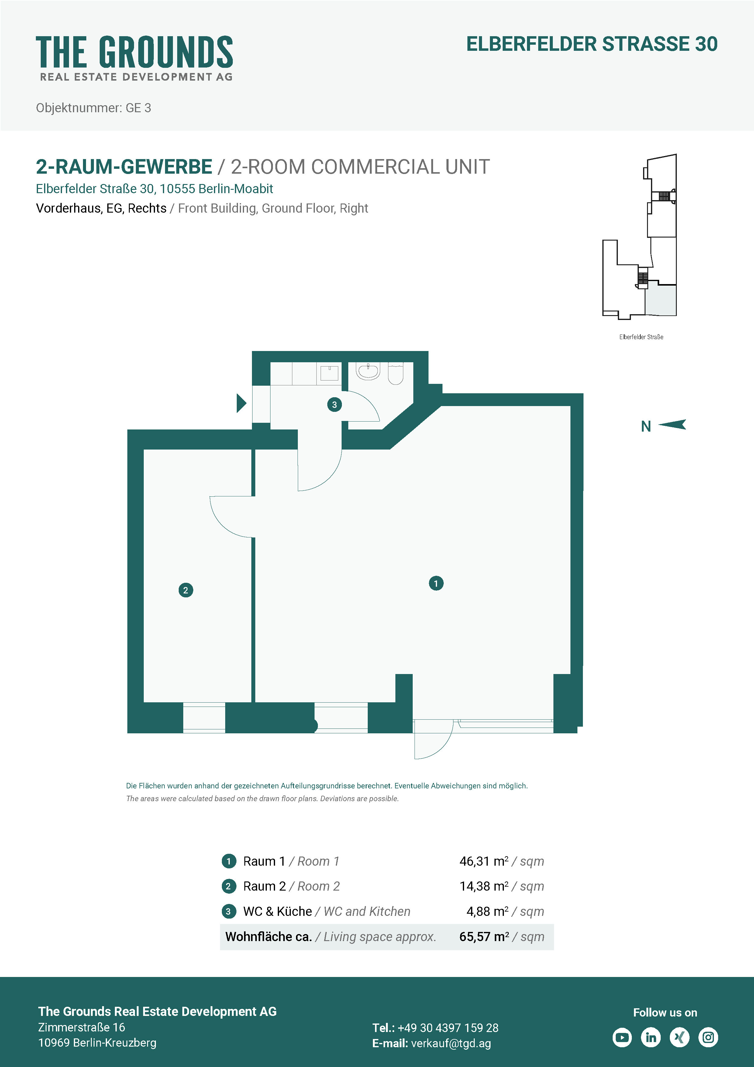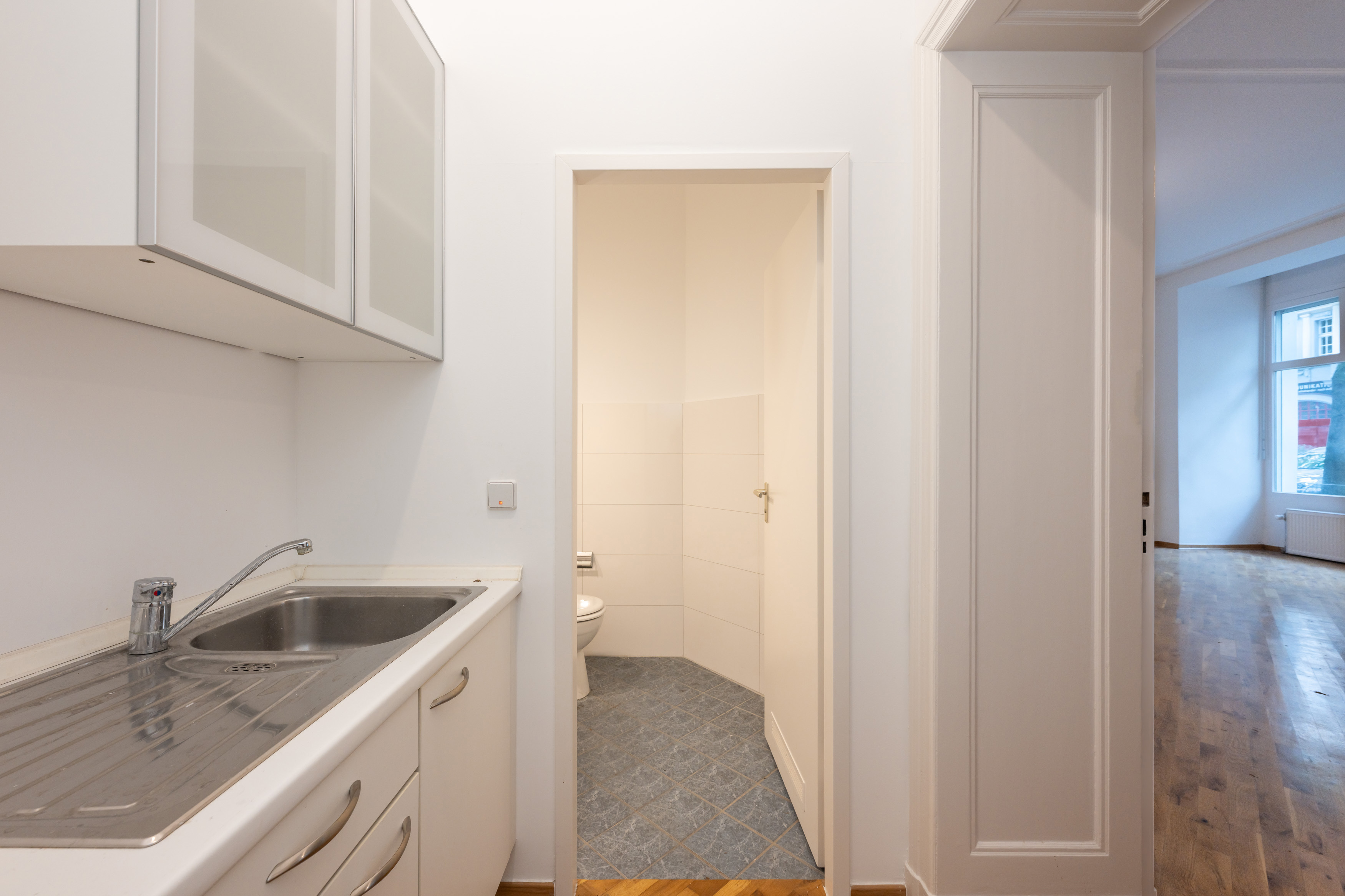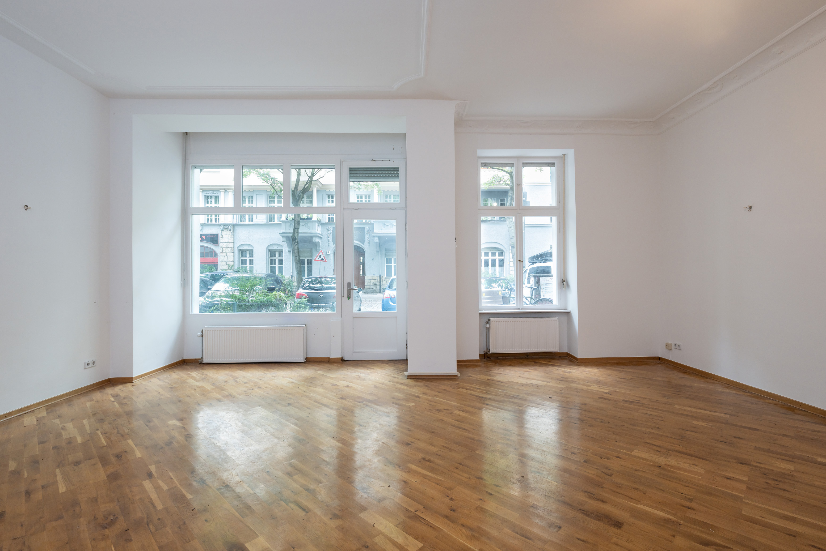 Diese bezugsfertige Gewerbeeinheit in Moabit liegt im Erdgeschoss eines stilvollen Altbaus und erstreckt sich über ca. 66 m². Die Räumlichkeiten überzeugen durch einen klassischen Parkettboden, der den beiden Haupträumen eine warme Ausstrahlung verleiht. Großzügige Fensterflächen sorgen für ein lichtdurchflutetes Ambiente. Eine kleine Küche und ein separates WC runden das Angebot im rückwärtigen Bereich ab.