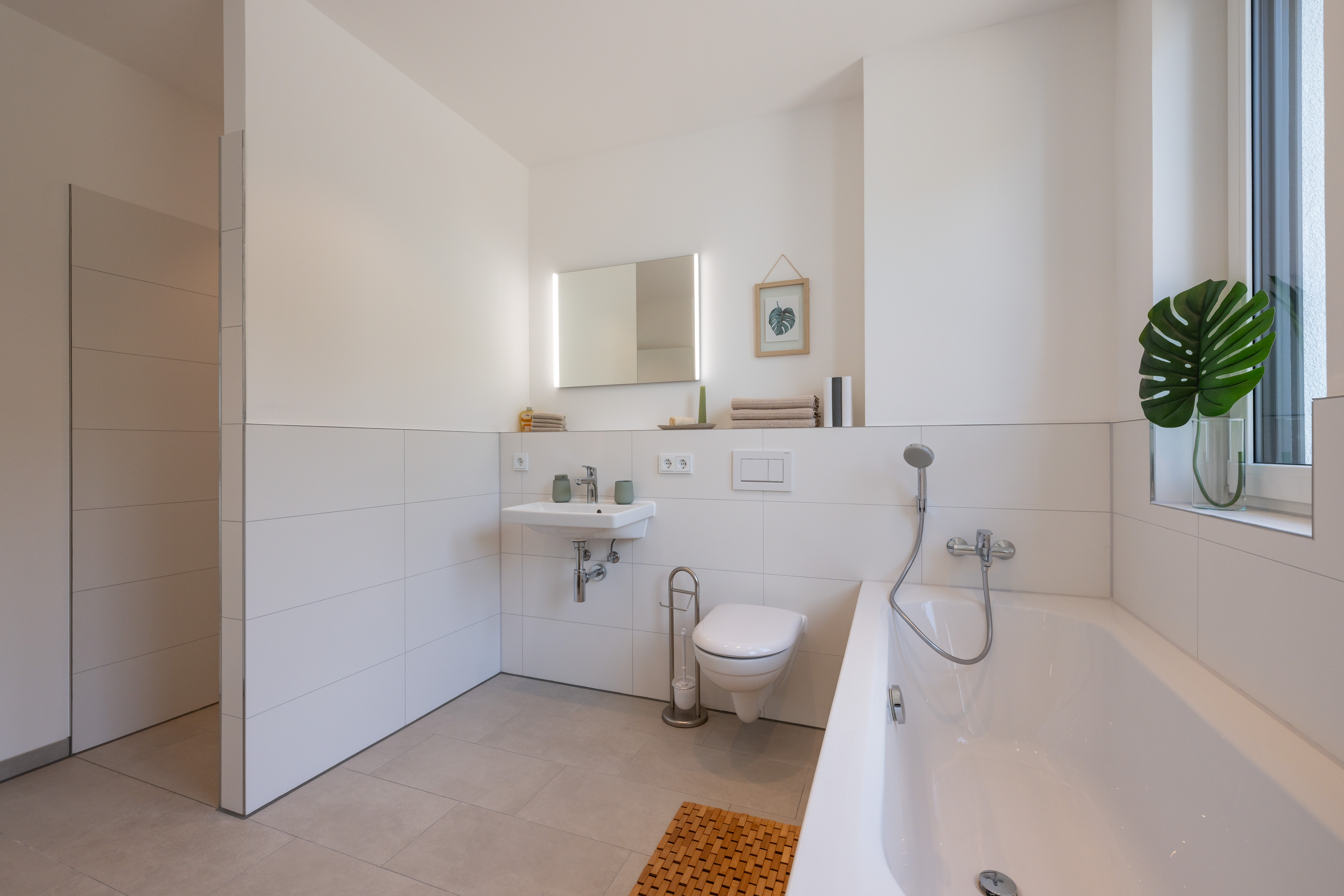 Im Obergeschoss befindet sich das geräumige Schlafzimmer. Gegenüber liegt ein großes Wannen-Dusch-Bad mit Tageslicht. Zudem befindet sich im Erdgeschoss ein vollwertiges Duschbad. Beide Bäder sind gefliest und mit Sanitärelementen und Armaturen von namhaften Herstellern ausgestattet. Die Fußbodenheizung mit Einzelraumregelung liefert in allen Wohnräumen wohlige Wärme. In den Wohn-, Schlaf- und Kinderzimmern ist Mehrschicht-Eichenparkett verlegt, das für einen angenehmen Komfort sorgt.