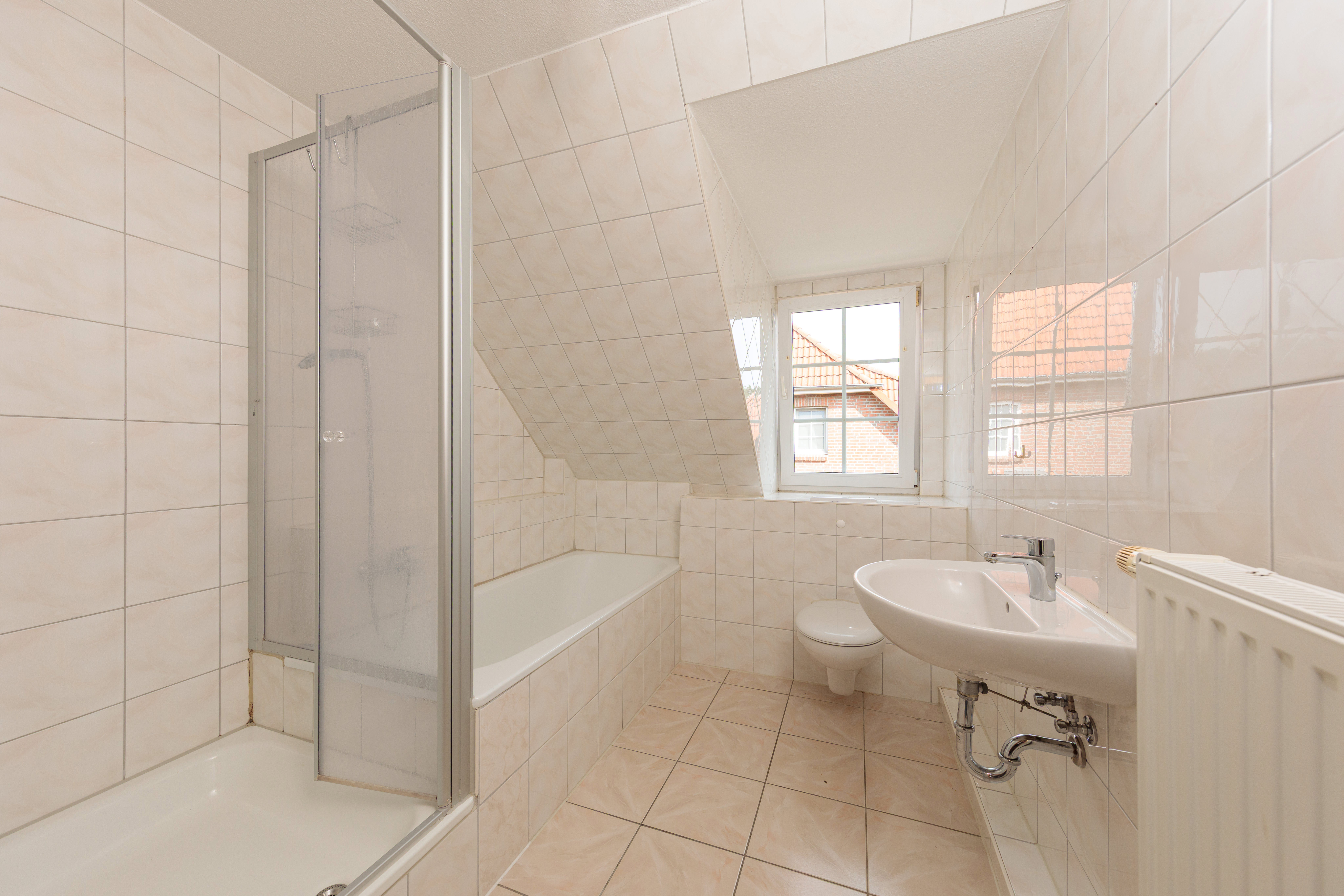 Neben dem großzügig dimensionierten Badezimmer im ersten Obergeschoss gibt es im Erdgeschoss ein Gäste-WC. Die Böden im Erdgeschoss sowie im Badezimmer sind gefliest. In den Wohnräumen des Obergeschosses wurde Laminat/ ein textiler Boden / PVC verlegt.